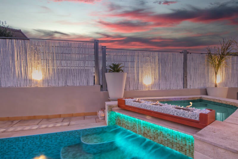 Sunset Bay Pool Villa è una villetta che vi accoglierà in un ambiente luminoso e rilassante. Il punto di forza di Sunset Bay Pool Villa è la meravigliosa piscina a sfioro raggiungibile da entrambe le camere da letto. L’ingresso è con pendenza naturale che raggiunge una profondità massima di 2 mt dove è possibile azionare il nuoto controcorrente. Il rivestimento interno è in mosaico di un colore particolare che rende l'acqua color smeraldo. La piscina è completata da una vasca idromassaggio jacuzzi a 4 postazioni che si unisce alla piscina con una cascata luminosa. A vostra disposizione una comoda doccia e nell'area prendisole due comode chaiselonge un divanetto posizionato sotto una pergola. L'acqua della piscina è riscaldata nel mese di maggio e dal 15 settembre al 15ottobre. Nel cortile antistante troverete un area conviviale caratterizzata da una pergola fiorita a ridosso del giardino che presenta piante di agrumi e diverse tipologie di piante ornamentali. Una seconda area relax vi aspetta sotto una veranda e nascosta da un paravento di bamboo giapponese dove è posizionata una sedia sospesa e un comodo divanetto per le vostre serate all'aria aperta. Qui troverete anche un barbecue per le vostre grigliate. All'interno la villetta si presenta arredata in stile moderno nei toni del bianco nero e con contrasti di turchese e oro rosa. Negli ambienti padroneggiano degli imponenti